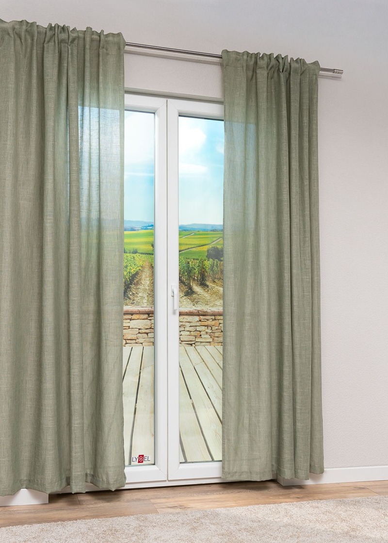 - Ein transparenter Vorhang aus 88% Polyester, 12% Leinen, (50% recycelt).